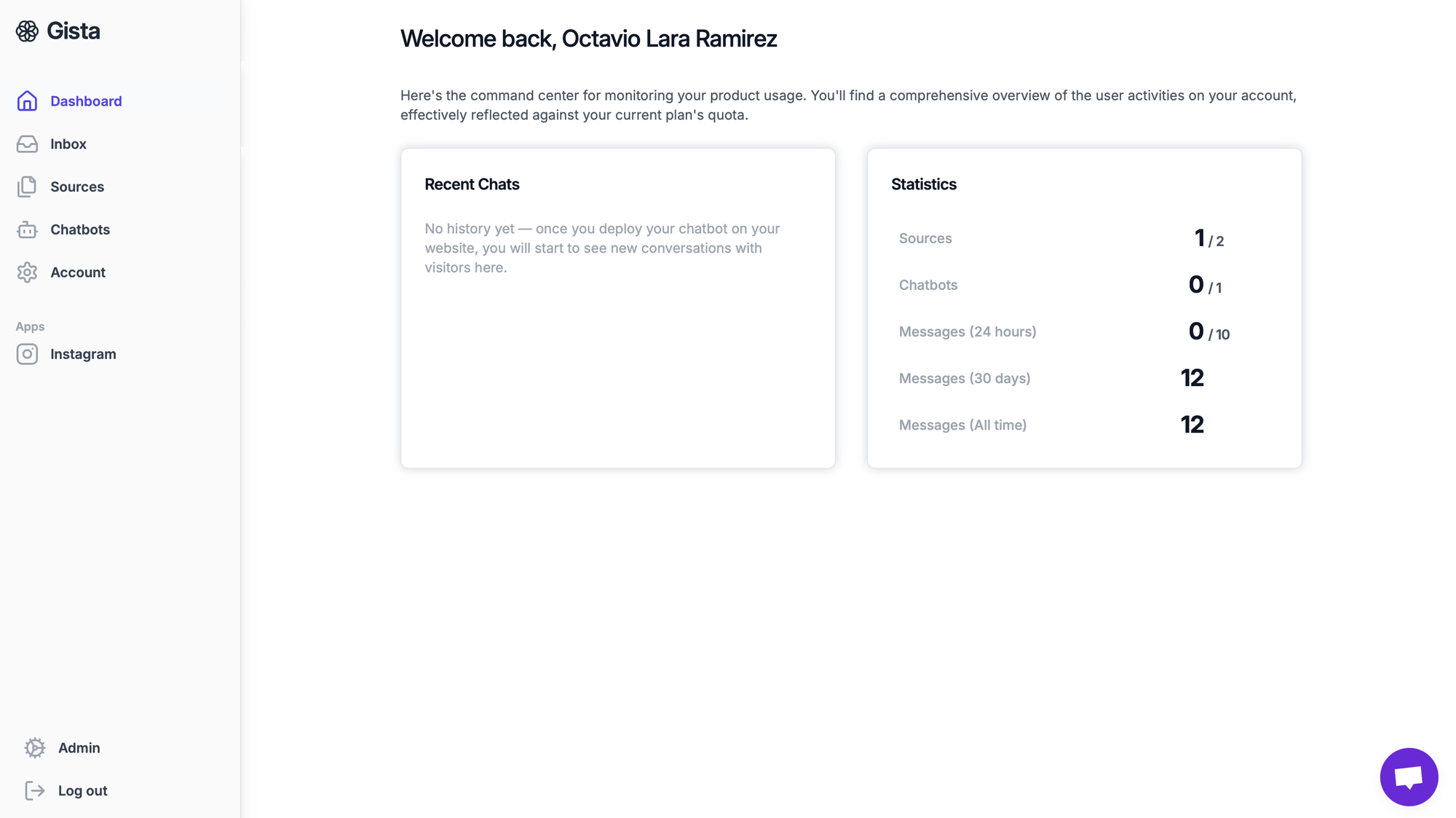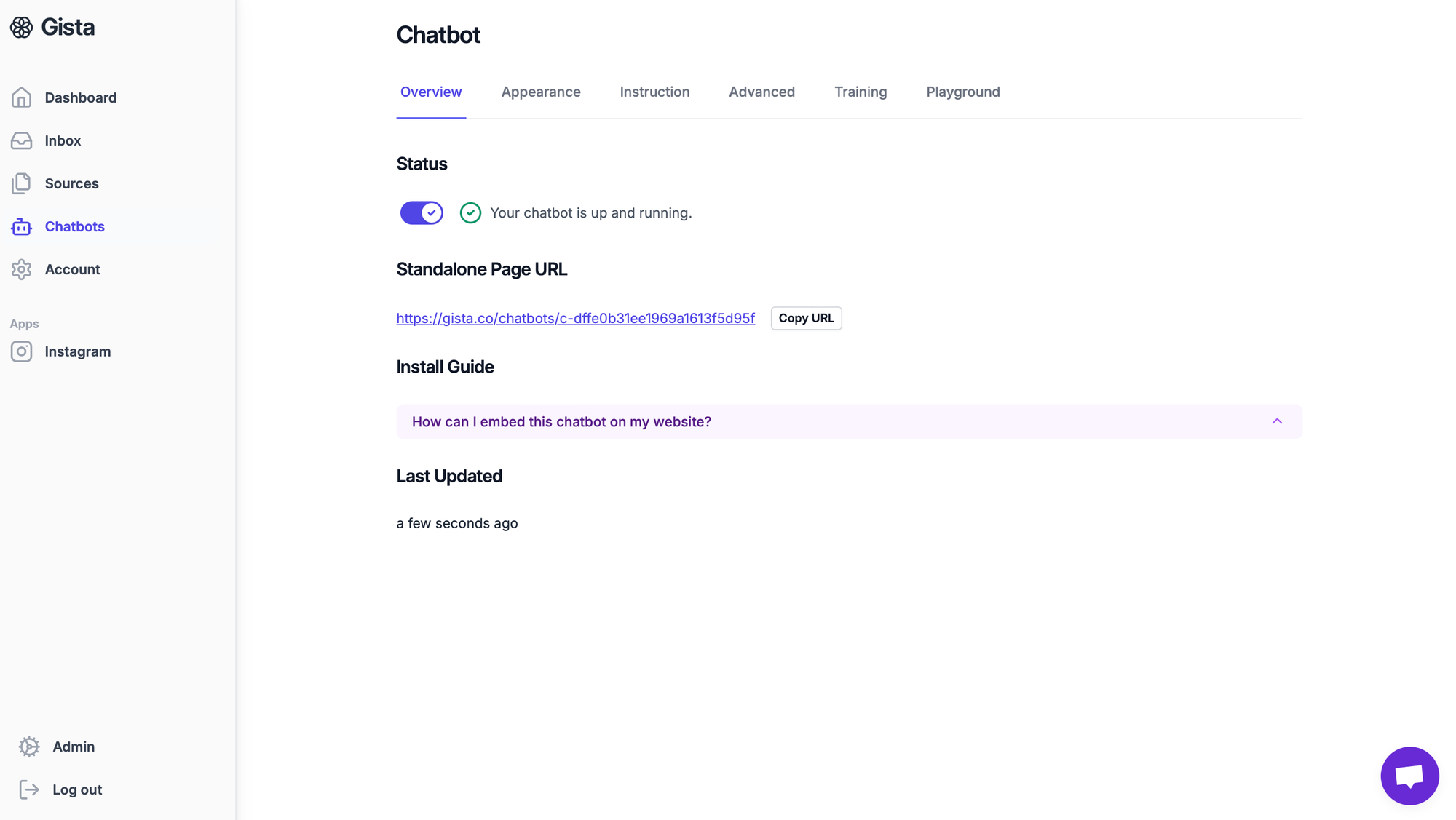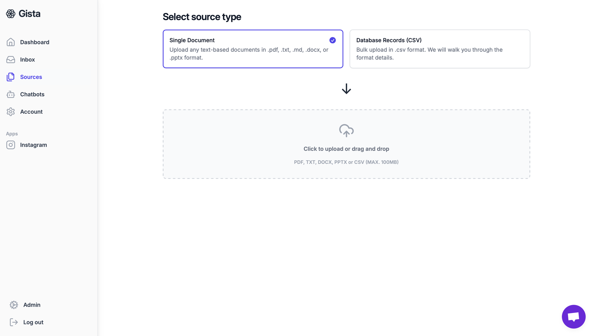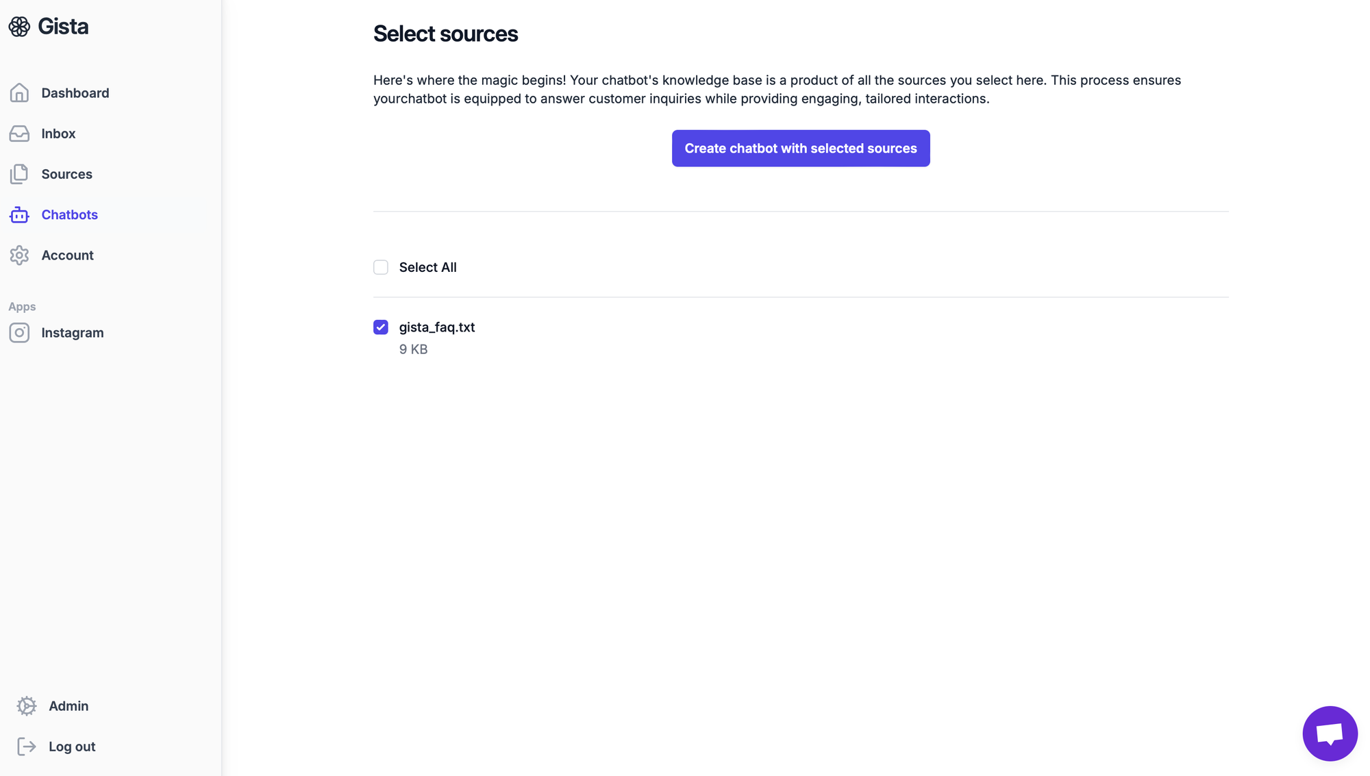 Okay, at this step your page should look like the screen above. From here we're going to move to the "Chatbot" tab and select the source you uploaded to create the chatbot.
